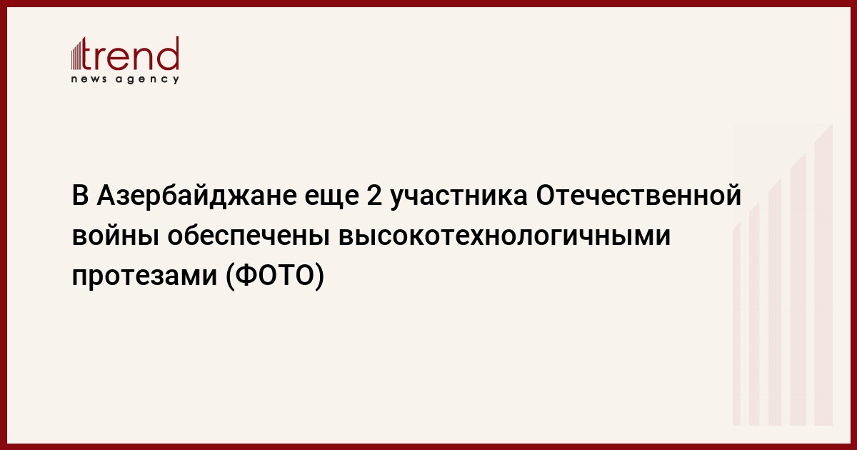 БАКУ /Trend/ - Министерство труда и социальной защиты населения Азербайджана обеспечило высокотехнологичными протезами еще двух частников Отечественной войны - Мамишова Башира Махеддин оглу и Гусейналиева Фаига Бахруз оглу, сообщает в субботу Trend со ссылкой на ведомство.