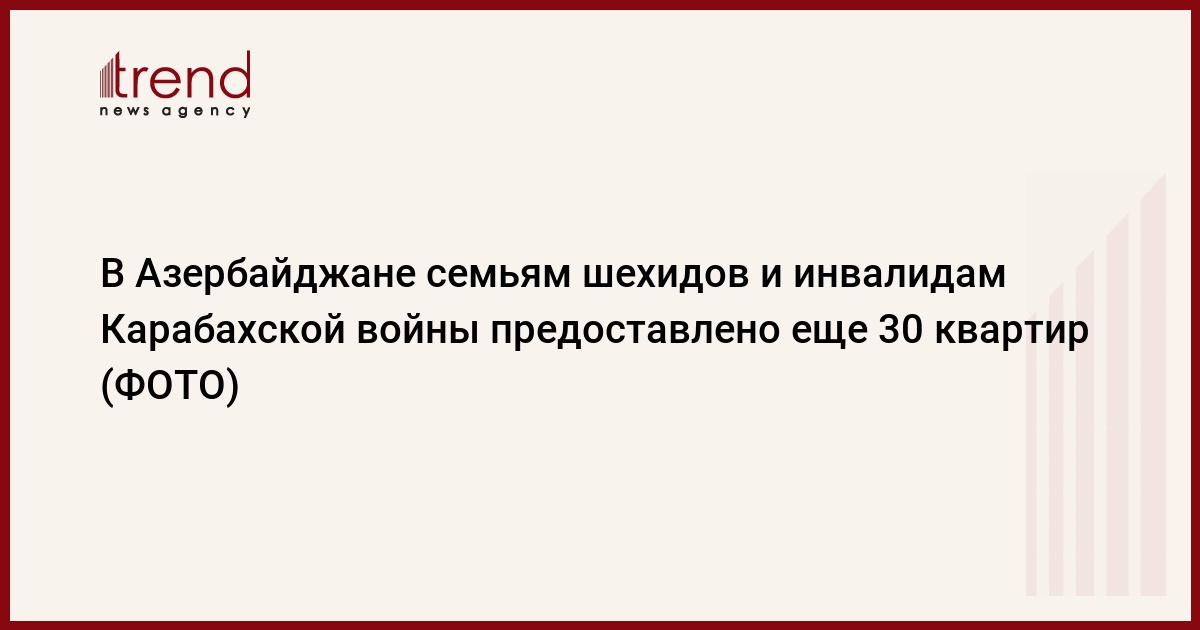 БАКУ /Trend/ - Министерство труда и социальной защиты населения Азербайджана предоставило семьям шехидов и инвалидам Карабахской войны еще 30 квартир в жилом комплексе в бакинском поселке Рамана, сообщает в пятницу Trend со ссылкой на ведомство.
