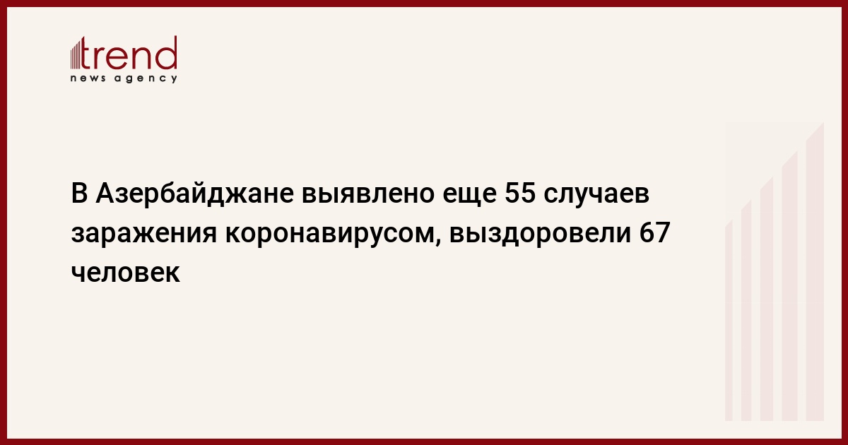 БАКУ /Trend/ - В Азербайджане за минувшие сутки выявлено еще 55 случаев заражения коронавирусом, 67 человек выздоровели, двое - скончались, сообщает в субботу Trend со ссылкой на Оперативный штаб при Кабмине.
