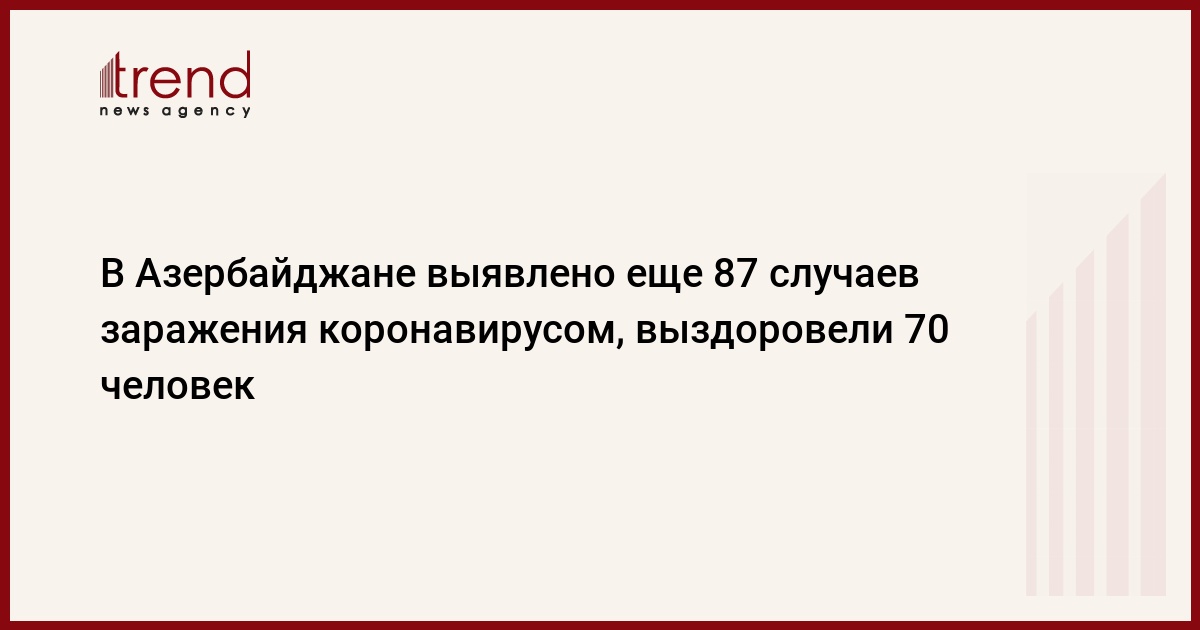 БАКУ /Trend/ - В Азербайджане за минувшие сутки выявлено еще 87 случаев заражения коронавирусом, 70 человек выздоровели, трое скончались, сообщает во вторник Trend со ссылкой на Оперативный штаб при Кабмине.