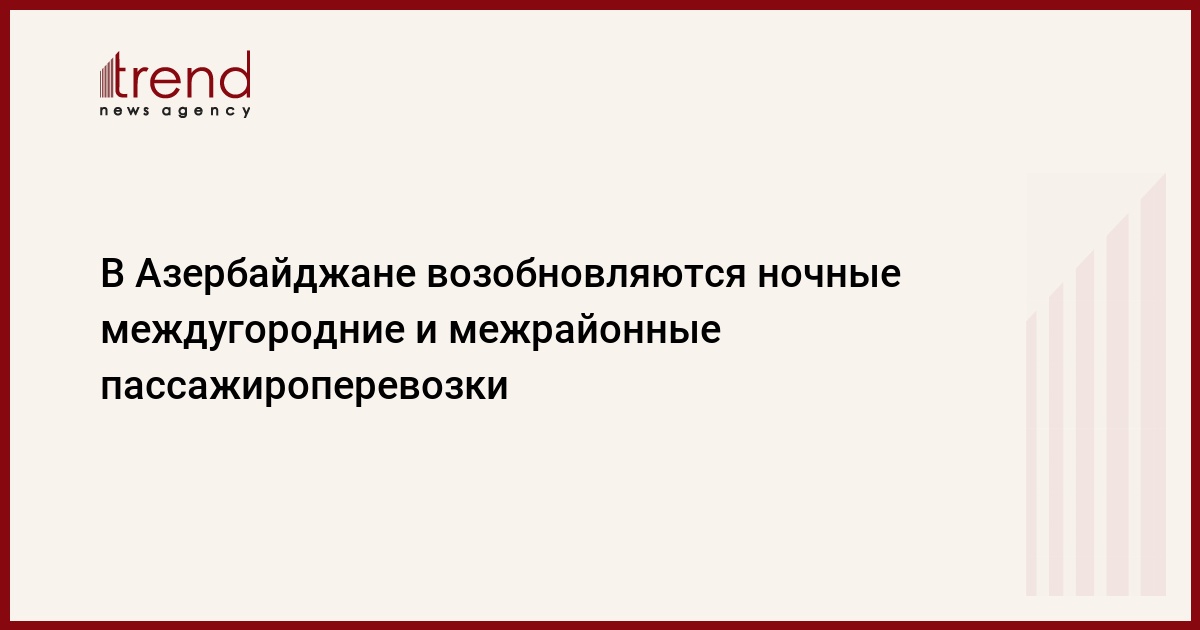 БАКУ /Trend/ - Учитывая многочисленные обращения граждан и компаний - перевозчиков, с 15 июля в Азербайджане возобновляются ночные междугородние и межрайонные пассажироперевозки, сообщает в четверг Trend со ссылкой на Госслужбу автомобильного транспорта при министерстве транспорта, связи и высоких технологий.