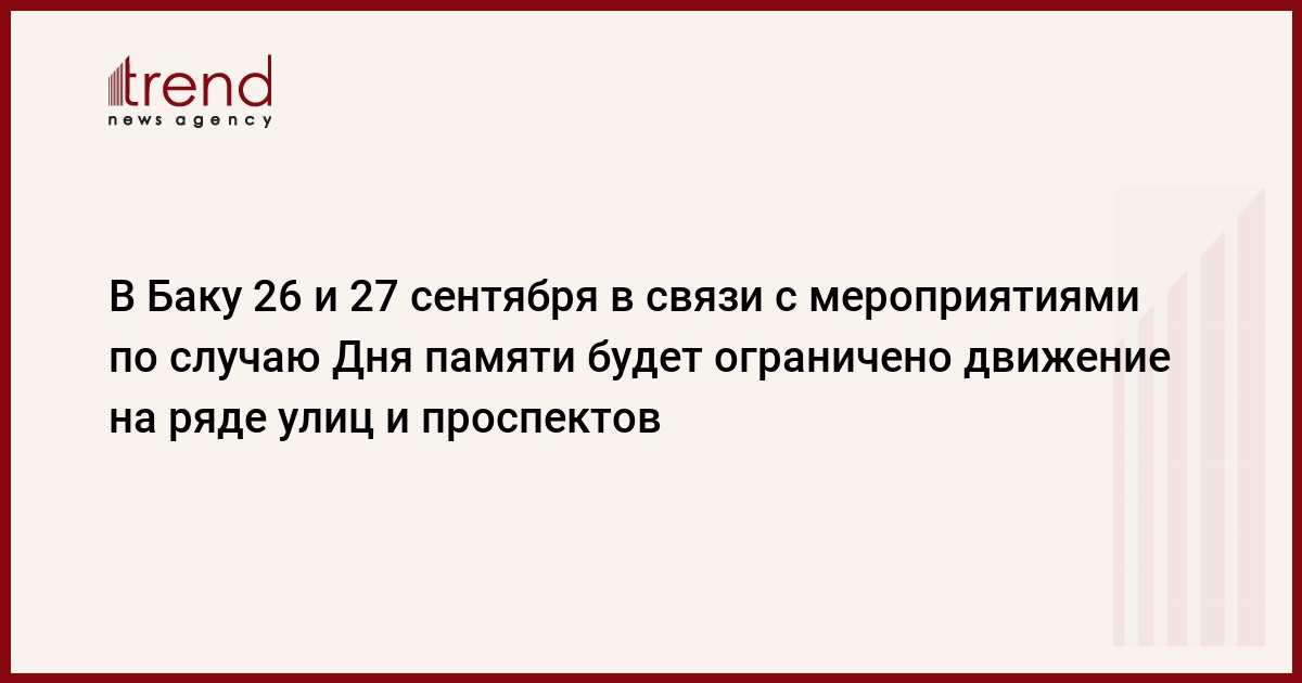 По словам Аскерли, в связи с проведением мероприятия по случаю Дня памяти на перечисленных улицах 26 сентября с 07:30 до 10:00 и 27 сентября с 06:30 до 14:00 движение автомобилей будет ограничено.