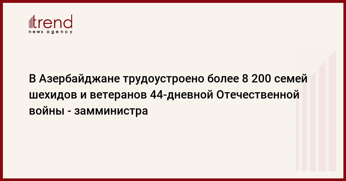 БАКУ /Trend / - В Азербайджане трудоустроено более 8 200 семей шехидов и ветеранов 44-дневной Отечественной войны.