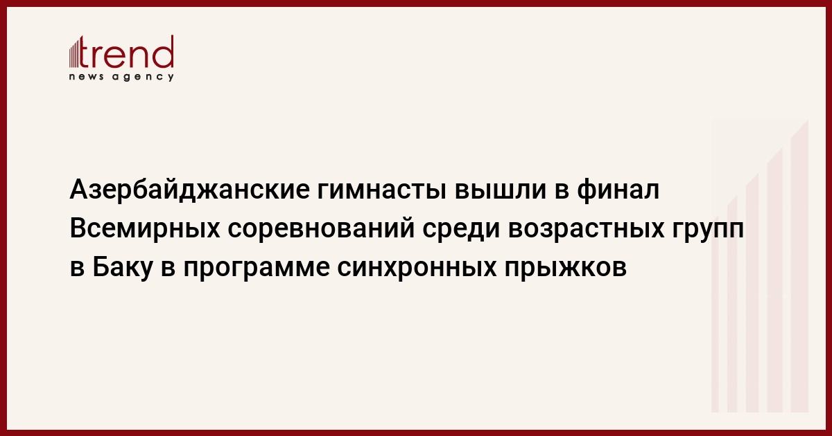 БАКУ /Trend/ - Азербайджанские гимнасты Ибрагим Мустафазаде и Аммар Бахшалиев, выступающие в программе синхронных прыжков на батуте в возрастной категории 11-12 лет, вышли в финал 28-х Всемирных соревнований среди возрастных групп по прыжкам на батуте, двойном мини-батуте и акробатической дорожке (тамблинг) в Баку, сообщает в четверг Trend.