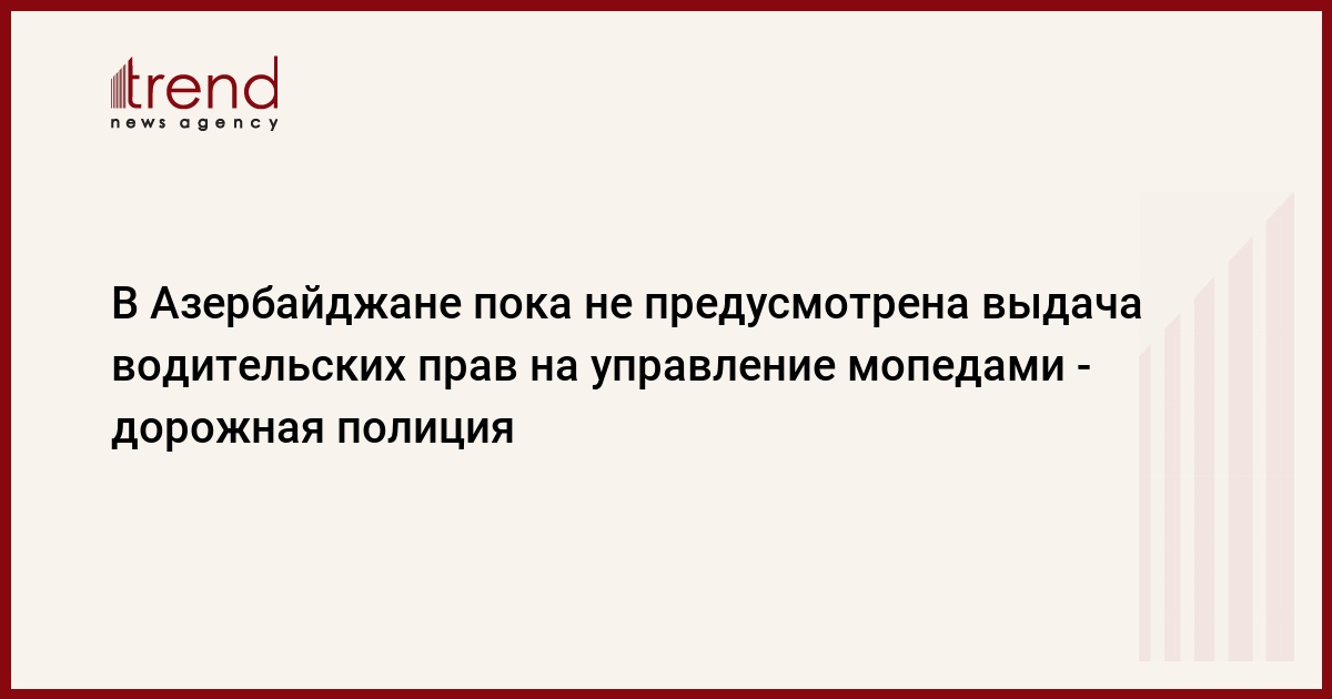 БАКУ /Trend/ - В Азербайджане пока не предусмотрена выдача водительских прав на управление мопедами, то есть транспортными средствами с объемом двигателя до 50 кубических сантиметров, а также их государственная регистрация.