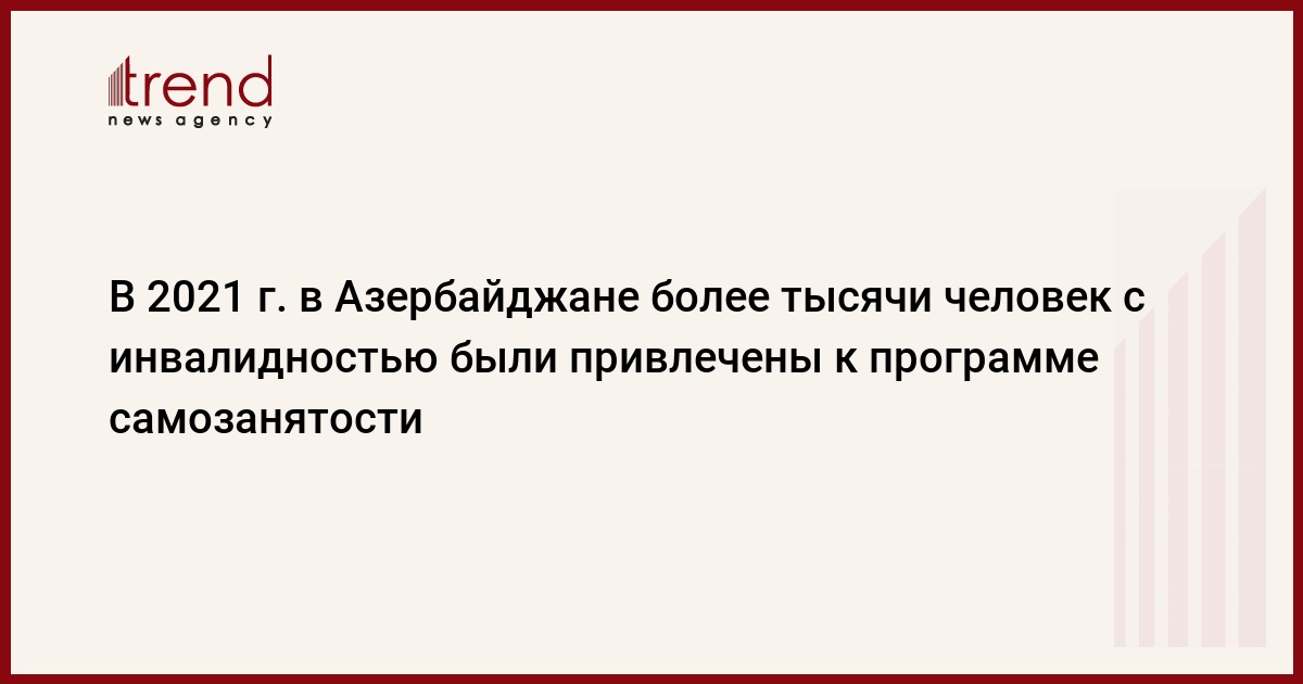 БАКУ /Trend/ - В 2021 году в Азербайджане к программе самозанятости были привлечены более тысячи человек с инвалидностью, сообщили Trend в среду в министерстве труда и социальной защиты.