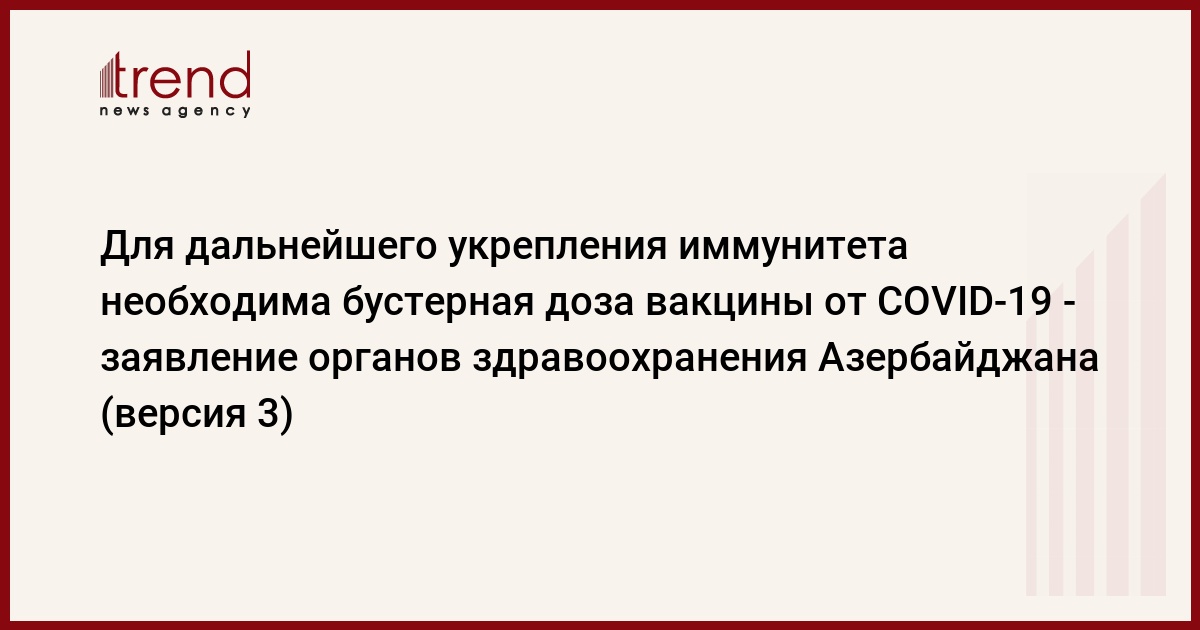 БАКУ /Trend/ - Для дальнейшего укрепления иммунитета рекомендуем гражданам Азербайджана получить бустерную дозу вакцины от COVID-19.