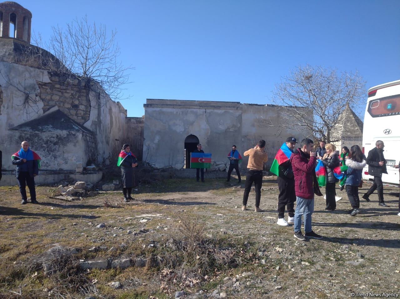 Пассажиры автобуса, прибывшие в Агдам, посетили комплекс Имарат, построенный Панахали ханом в XVIII веке. Здесь они ознакомились с разрушенной армянами могилой Хуршидбану Натаван и другими историческими памятниками, подвергшимися армянскому вандализму.