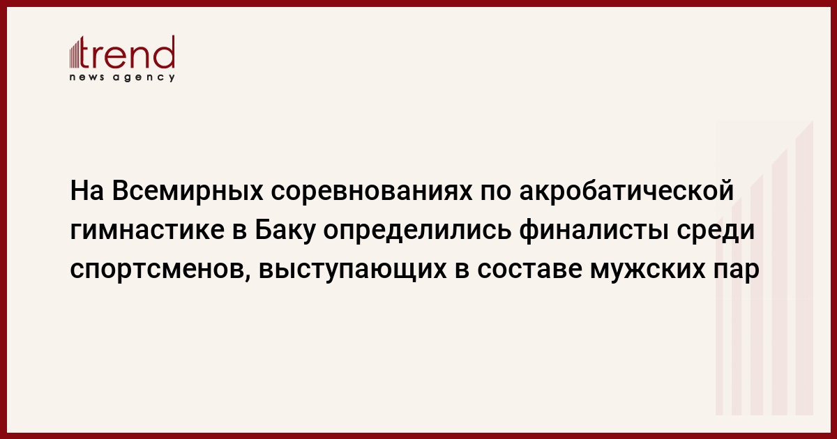 БАКУ /Trend/ - В Национальной арене гимнастики в Баку в рамках второго дня 12-х Всемирных соревнований среди возрастных групп по акробатической гимнастике определились финалисты среди мужских пар в возрастной категории 12-18 лет, сообщает в пятницу Trend.