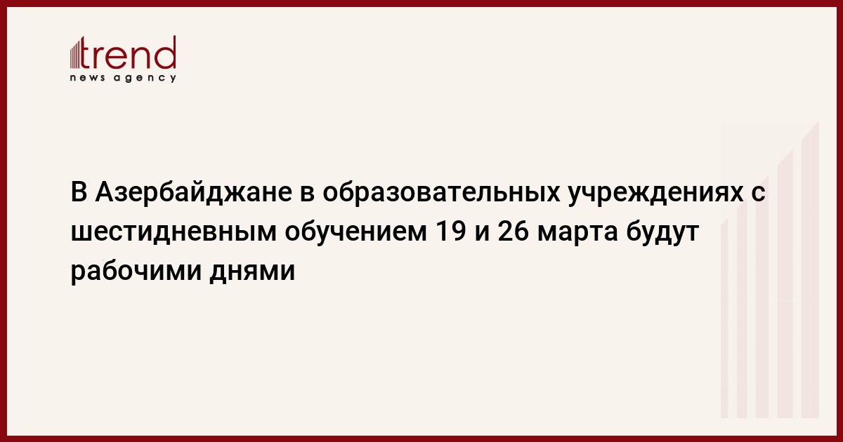 БАКУ /Trend/ - В образовательных учреждениях с 6-дневным обучением последним рабочим (учебным) днем перед предстоящими праздниками является 19 марта.