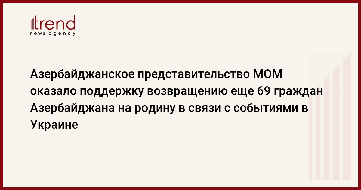 Как сообщили Trend в пресс-службе Азербайджанского представительства МОМ, благодаря слаженной работе сотрудников МОМ и сотрудничеству с правительством Азербайджана еще 69 граждан Азербайджана, которые перешли из Украины в польский город Катовице, были отправлены автобусом в Бухарест. Как только они прибудут в Бухарест, официальные лица Азербайджана организуют их эвакуацию в Баку.