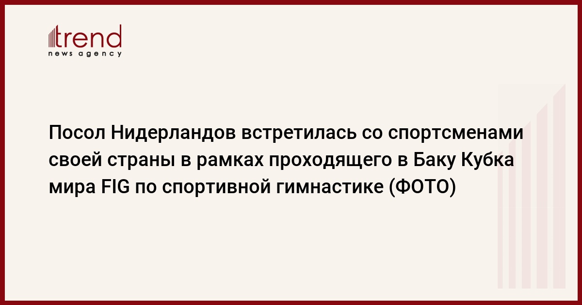 БАКУ /Trend/ - Посол Нидерландов в Азербайджане Паулине Эиземан встретилась со спортсменами своей страны в рамках проходящего в Национальной арене гимнастики в Баку Кубка мира FIG по мужской и женской спортивной гимнастике, сообщает в субботу Trend.