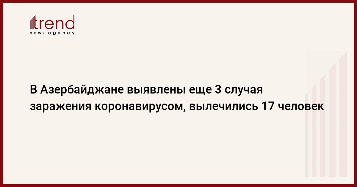 БАКУ /Trend/ - В Азербайджане за последние сутки выявлены три случая заражения коронавирусом, вылечились 17 человек, передает в понедельник Trend со ссылкой на Оперативный штаб при Кабмине.