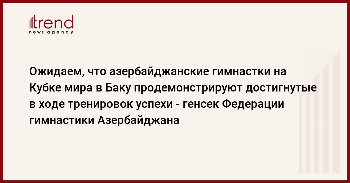 БАКУ /Trend/ - Ожидаем, что азербайджанские спортсменки на Кубке мира в Баку достойно продемонстрируют достигнутые в ходе тренировок успехи. Об этом, как сообщает Trend, сказала в пятницу журналистам генеральный секретарь Федерации гимнастики Азербайджана Нурлана Мамедзаде.