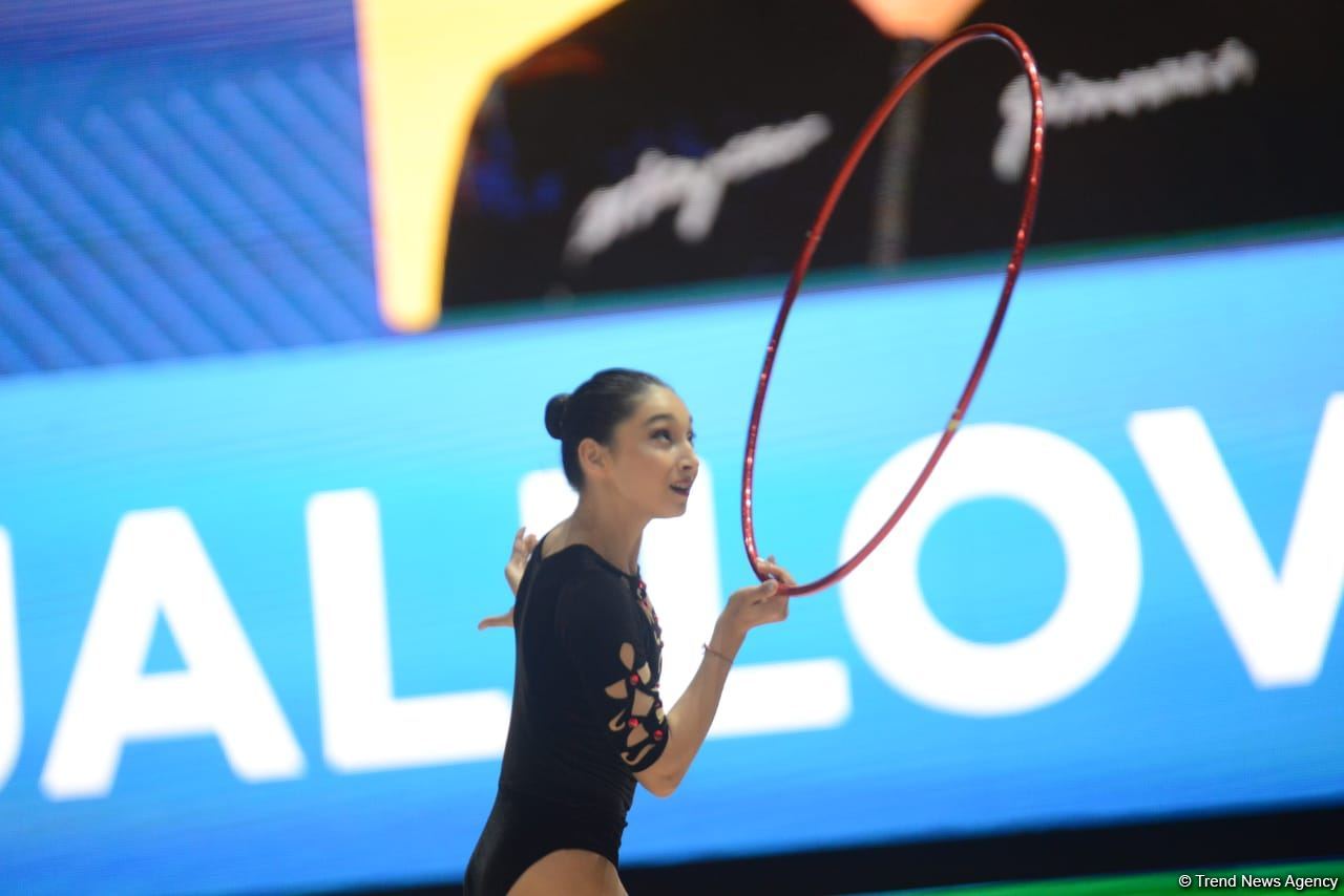 За выступление с обручем судьи поставили Арзу Джалиловой 32.050 балла, и на данный момент грация занимает первое промежуточное место. Зохра Агамирова получила 31.650 балла, и расположилась на второй промежуточной позиции.