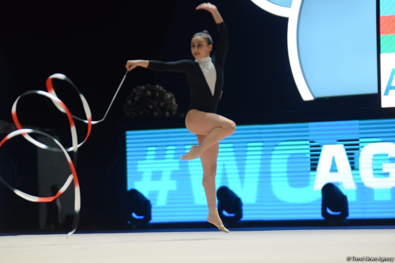 БАКУ /Trend/ - В рамках второго дня соревнований Кубка мира FIG по художественной гимнастике в Баку азербайджанские грации Арзу Джалилова и Зохра Агамирова выполнили упражнения с лентой, сообщает в субботу Trend.