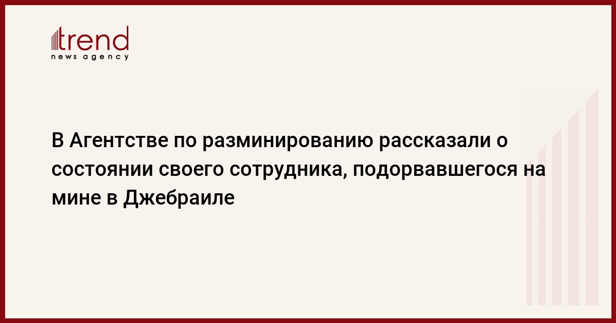 БАКУ /Trend/ - Около 09:00 17 июня 2022 года при исполнении сотрудником Агентства Азербайджана по разминированию Рухином Султан оглу Велиевым, 1991 года рождения, своих служебных обязанностей на территории освобожденного от оккупации Джебраильского района произошел взрыв противопехотной мины, сообщает в пятницу Trend со ссылкой на пресс-службу Агентства Азербайджана по разминированию.