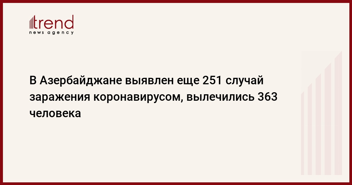 БАКУ /Trend/ - В Азербайджане за последние сутки выявлен 251 случай заражения коронавирусом, 363 человека вылечились, 4 - скончались, передает в среду Trend со ссылкой на Оперативный штаб при Кабмине.
