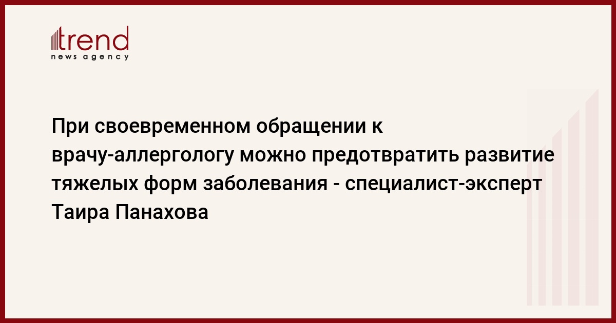БАКУ/Trend/ - При своевременном обращении к врачу-аллергологу можно предотвратить развитие тяжелых форм заболевания. Как сообщает в пятницу Trend со ссылкой на минздрав Азербайджана, об этом сказала специалист-эксперт министерства Таира Панахова.