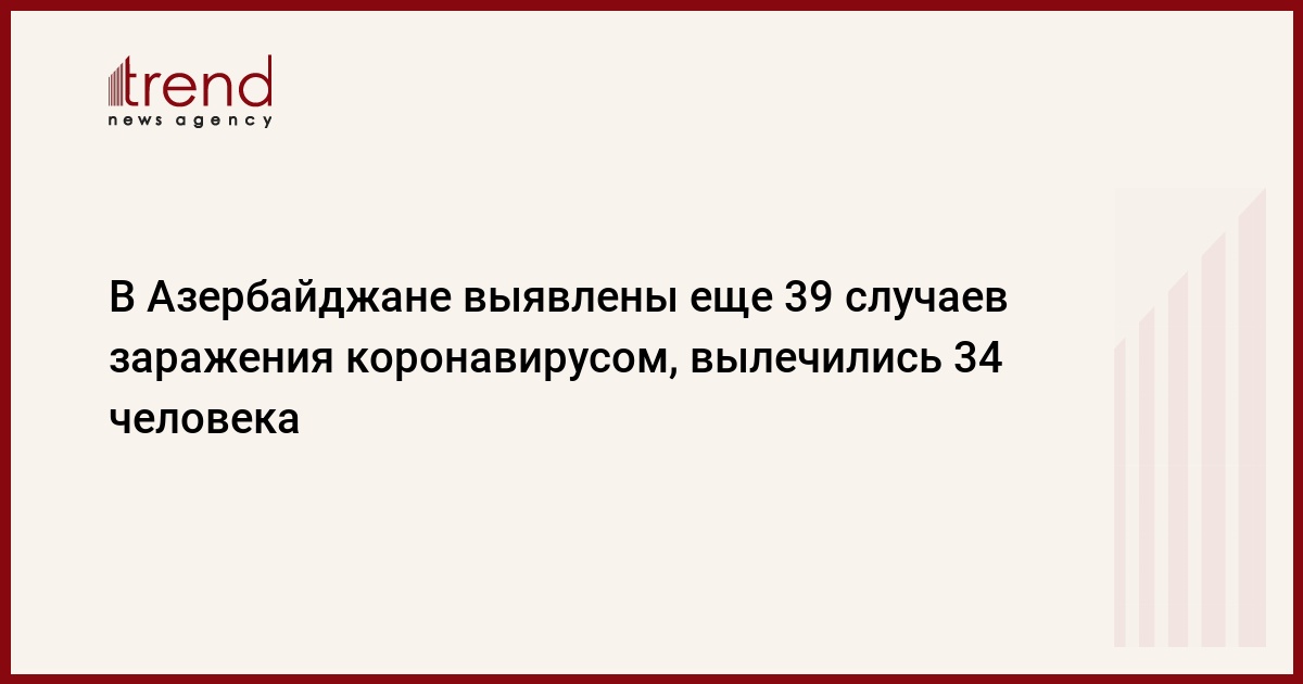 БАКУ /Trend/ - В Азербайджане за последние сутки выявлены 39 случаев заражения коронавирусом, 34 человека вылечилис, передает в воскресенье Trend со ссылкой на Оперативный штаб при Кабмине.
