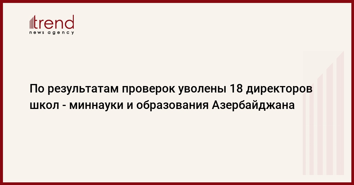 Как сообщили в среду Trend в министерстве, в общеобразовательных учреждениях были проведены проверки по осуществлению школьного руководства, организации обучения, кружков и внеклассных занятий, распределению учебной нагрузки между учителями, посещаемости учащихся и сотрудников, составлению учебно-педагогической документации, а также выполнению должностных обязанностей по кадровому администрированию, трудовой дисциплине работников и по другим сферам деятельности. По результатам проверок за недостатки в работе 18 директоров общеобразовательных учреждений были освобождены от занимаемой должности.