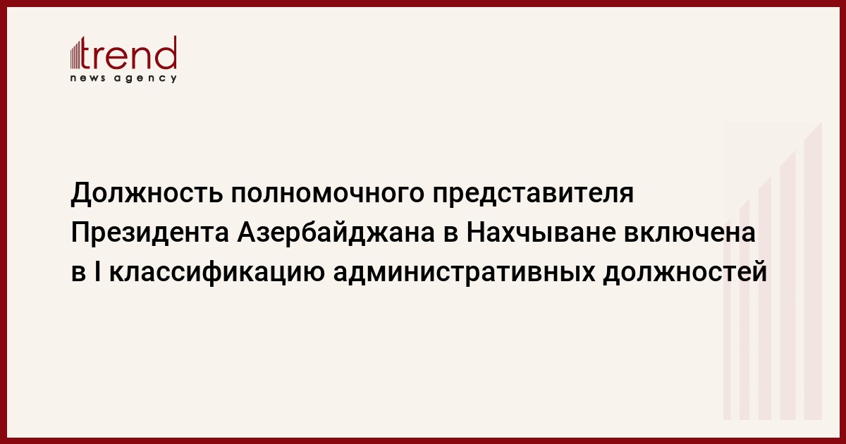 БАКУ /Trend/ - Должность полномочного представителя Президента Азербайджана в Нахчыване включена в I классификацию административных должностей.