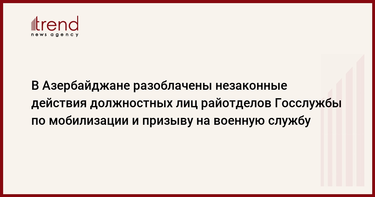 БАКУ /Trend/ - В результате оперативно-розыскных мероприятий, проведенных Главным управлением по борьбе с коррупцией при Генеральном прокуроре Азербайджана, разоблачены незаконные действия должностных лиц Джалилабадского и Лачинского районных отделов Государственной службы по мобилизации и призыву на военную службу.