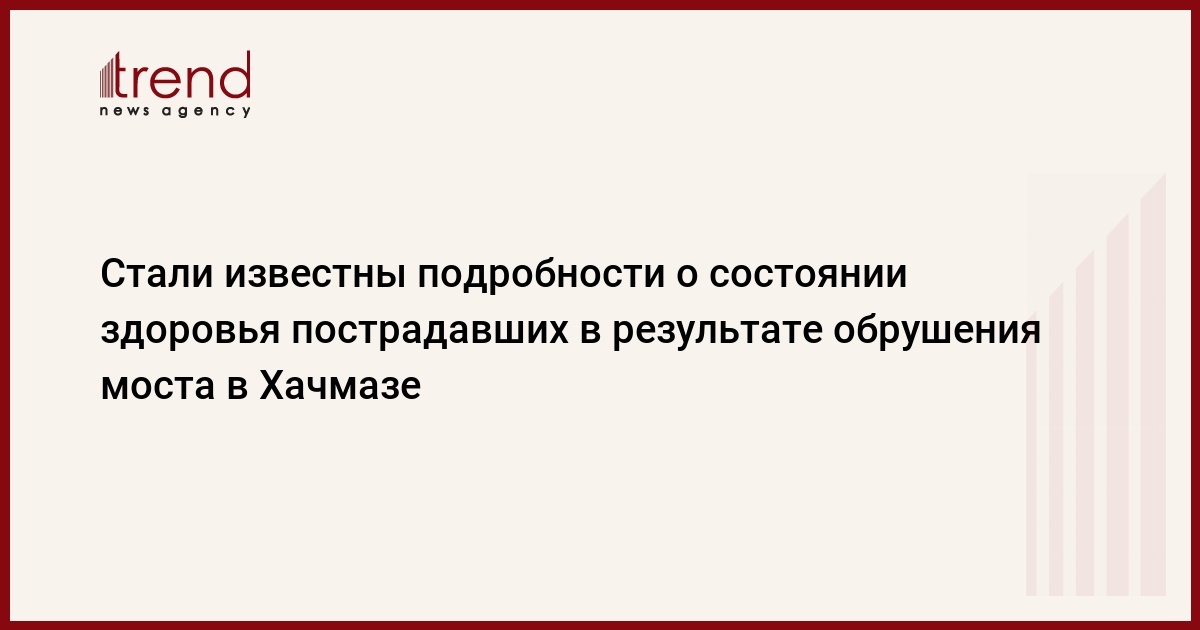 БАКУ /Trend/ - Трое пострадавших в результате обрушения моста на 27-м километре автодороги Гяндоб-Хачмаз-Ялама - госграница с РФ на территории села Кёхне Хачмаз Хачмазского района помещены в отделение неотложной медицинской помощи Хачмазской районной центральной больницы подведомственной TƏBİB.