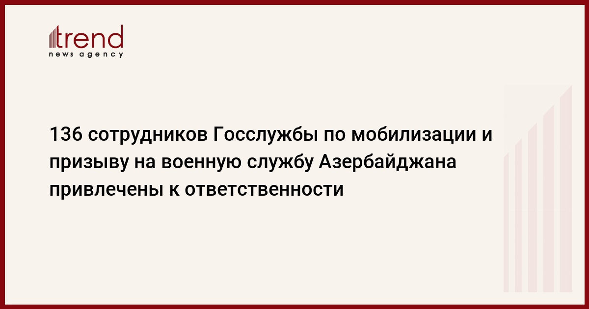 БАКУ /Trend/ - 136 сотрудников Государственной службы по мобилизации и призыву на военную службу Азербайджанской Республики привлечены к ответственности.