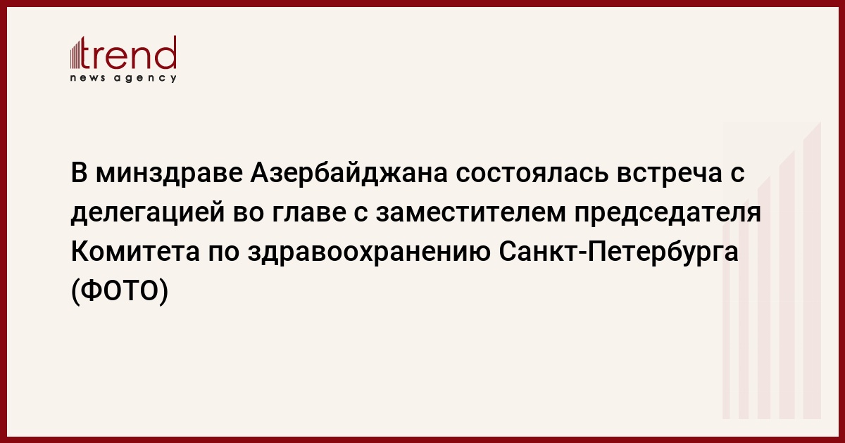 БАКУ /Trend/ - В рамках визита культурно-деловой миссии Санкт-Петербурга в столицу Азербайджана в министерстве здравоохранения Азербайджана состоялась встреча с делегацией во главе с заместителем председателя Комитета по здравоохранению Алексеем Терешиным.