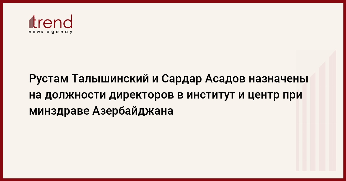 БАКУ /Trend/ - Рустам Талышинский и Сардар Асадов назначены на должности директоров в институт и центр, входящие в состав министерства здравоохранения Азербайджана.