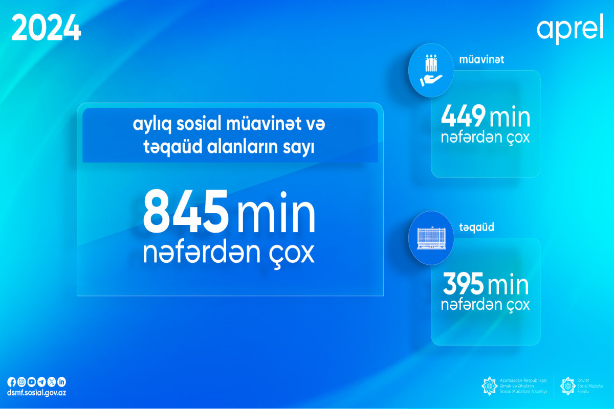 БАКУ /Trend/ - В апреле 2024 года число получателей ежемесячных социальных пособий и пенсий в Азербайджане превысило 845 тысяч человек.