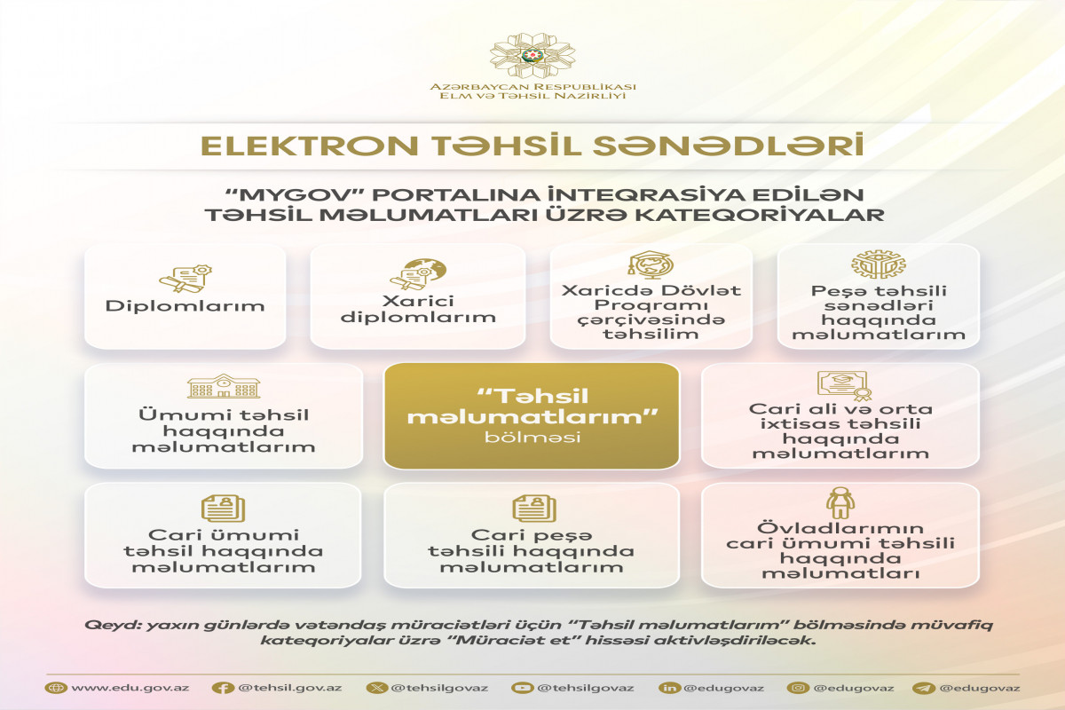 Отметим, что на портале my.gov.az отражаются все личные данные граждан. В ближайшие дни для обращений граждан в разделе "Информация о моем образовании" будет активирован подраздел "Подать заявку" по соответствующим категориям.