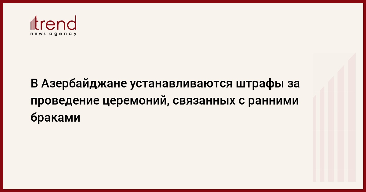 Согласно законопроекту, за проведение лицами, управляющими объектами общественного питания, церемоний, связанных со вступлением несовершеннолетних в брак (помолвка, свадьба и другие церемонии), физические лица будут оштрафованы в размере от тысячи до тысячи пятисот манатов, должностные лица - от трех тысяч до четырех тысяч манатов, юридические лица - от шести тысяч до девяти тысяч манатов.