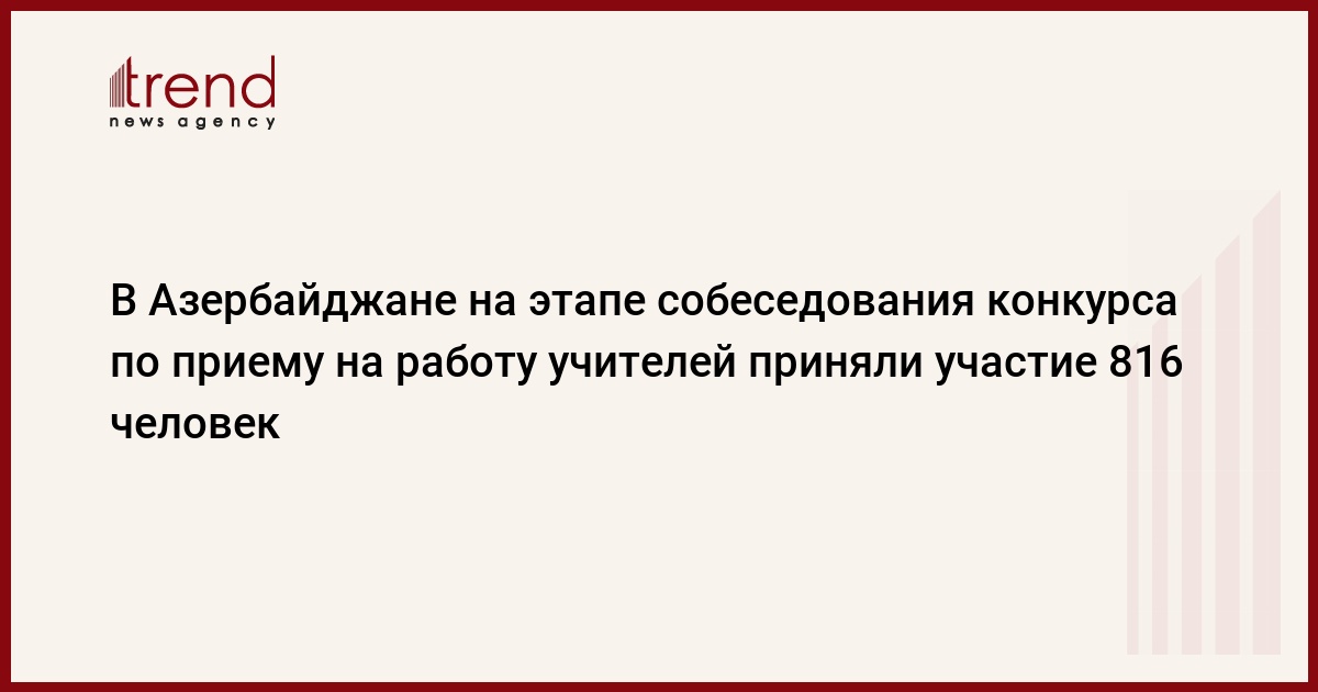 БАКУ /Trend/ - В рамках конкурса по приему на работу учителей 21 августа были организованы собеседования по азербайджанскому языку (русское отделение), биологии, физическому воспитанию, английскому языку, изобразительному искусству, физике и географии. На интервью были приглашены 872 человека. Из них 816 человек приняли участие в этапе собеседования.