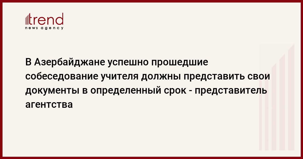БАКУ /Trend/ - 4 658 человек добились успеха на этапе собеседования конкурса по приему на работу учителей. Успешные кандидаты должны представить необходимые документы в соответствующий местный орган управления образования до 18:00 2 сентября.