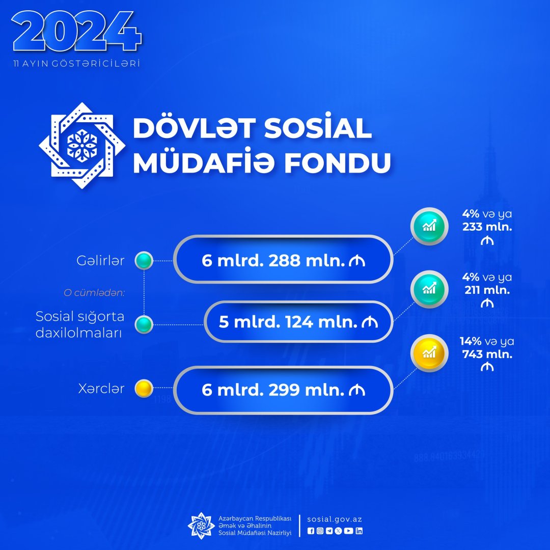"С января по ноябрь расходы ГФСЗ составили 6 миллиардов 299 млн манатов, что на 14 процентов, или 743 млн манатов больше по сравнению с соответствующим периодом прошлого года", - говорится в сообщении.