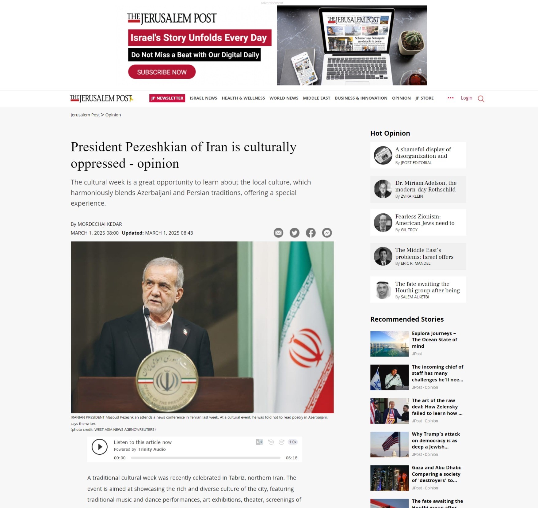В статье отмечается, что во время выступления Президента Пезешкиана на церемонии закрытия Недели культуры имел место драматический момент. Так, Пезешкиан почтил память известного поэта Мохаммеда Хосейна Бехджата Тебризи, известного в народе как "Шахрияр", процитировав несколько строк из его поэмы "Салам, Гейдар баба", написанной на азербайджанском языке. В это время один из организаторов мероприятия прервал речь главы государства и предупредил, чтобы тот не произносил стихотворение на азербайджанском языке. Пезешкиан, улыбаясь, сказал, что "от прочтения двух строф стихотворения на тюркском проблем не будет", вызвав аплодисменты собравшихся. Израильский профессор привел в статье с переводом строфы из стихотворения, произнесенные Президентом Ирана на азербайджанском языке.