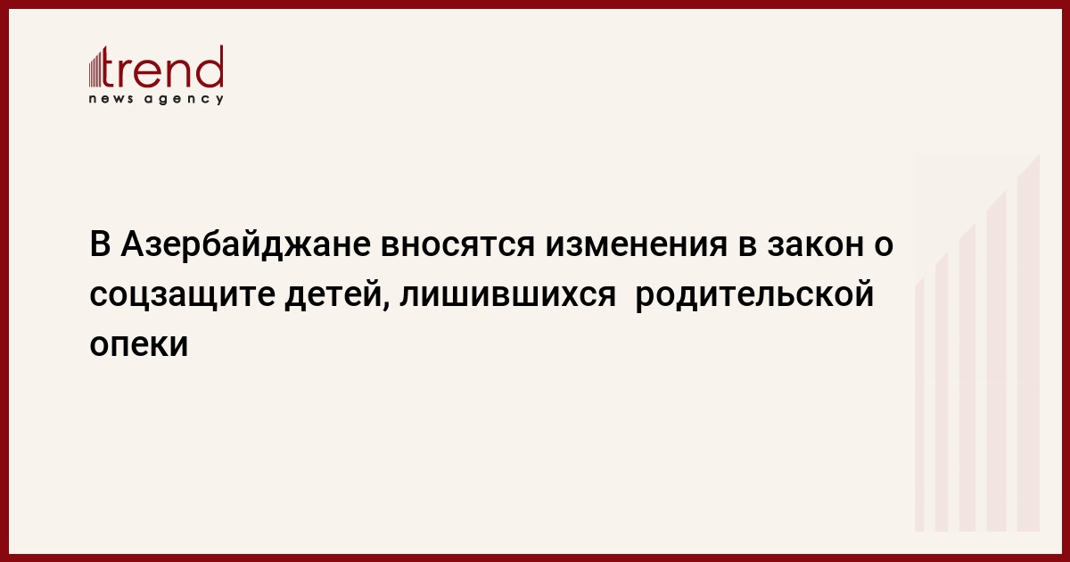 Как сообщает в пятницу Trend, этот вопрос нашел отражение в предложенной поправке к закону "О социальной защите детей, потерявших родителей и оставшихся без попечения родителей", которая обсуждалась сегодня на пленарном заседании Милли Меджлиса (парламент) Азербайджана.
