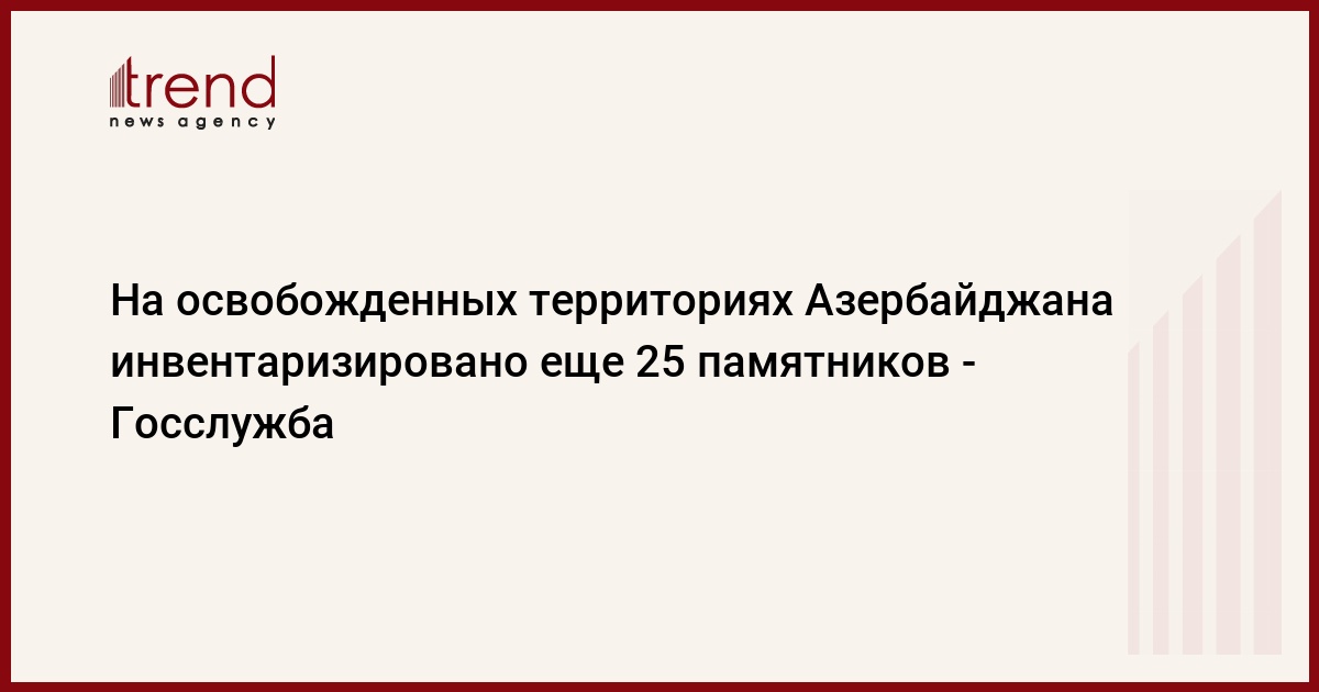БАКУ /Trend/ - В соответствии с указом Президента Азербайджанской Республики № 1170 от 29 октября 2020 года, продолжаются инвентаризационные работы, проводимые Государственной службой по охране, развитию и восстановлению культурного наследия при министерстве культуры на освобожденных территориях. В результате проведенных работ на территориях Агдамского, Физулинского, Агдеринского и Ходжалинского районов выявлено и инвентаризировано еще 25 историко-культурных памятников, из которых 16 - археологического и 9 - архитектурного значения.