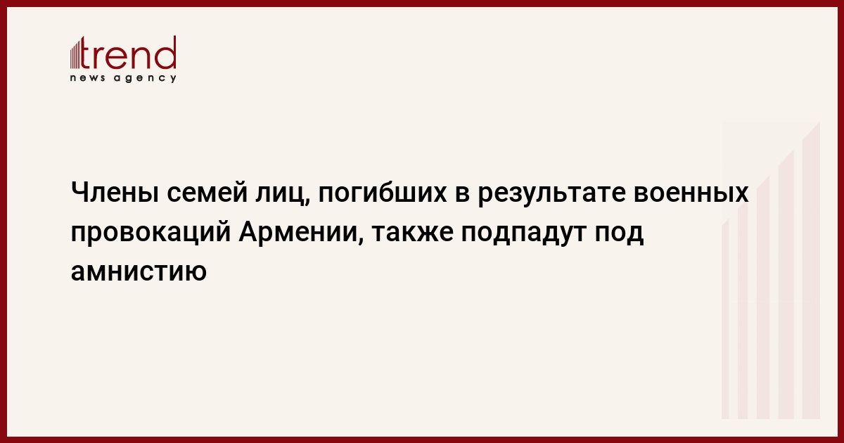 Согласно проекту постановления, амнистия будет применена также к близким родственникам лиц, ставших инвалидами или погибших в результате военных провокаций Армении в период Отечественной войны Азербайджана, и к членам семей лиц, погибших во время Ходжалинского геноцида.