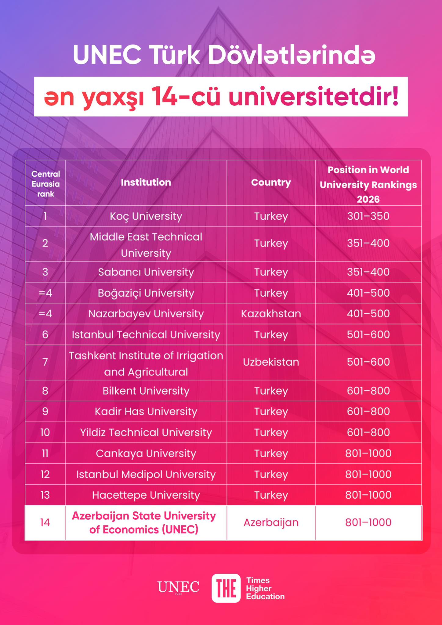 Университет Коч занял первое место среди 248 высших учебных заведений региона, Ближневосточный технический университет — второе, а Университет Сабанджи - третье. Казахстанский Назарбаевский университет занял четвертое место, а Ташкентский институт инженеров ирригации и механизации сельского хозяйства в Узбекистане, став седьмым, вошел в первую десятку. UNEC, заняв 1-е место в Азербайджане и 14-е место в общем рейтинге, вошел в число первых пятнадцати.