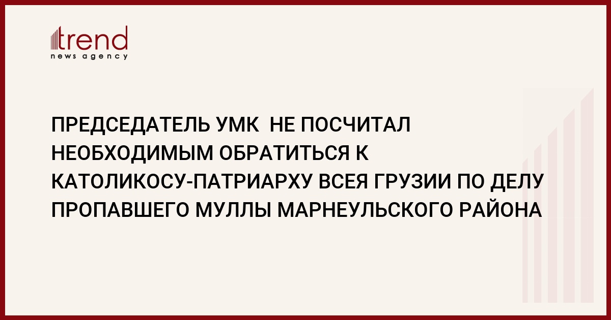 Председатель Управления мусульман Кавказа (УМК) Аллахшукюр Пашазаде не посчитал необходимым обратиться к Католикосу-Патриарху Всея Грузии Илие II по делу пропавшего муллы - жителя села Садахлы Марнеульского района - региона компактного проживания азербайджанцев в Грузии. Об этом Trend сообщил глава пресс-службы УМК Акиф Агаев.