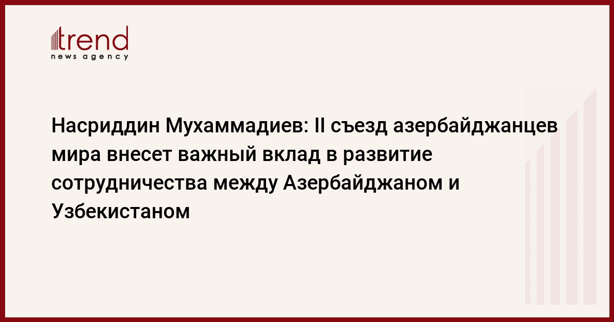 II съезд азербайджанцев мира внесет важный вклад в развитие сотрудничества между Азербайджаном и Узбекистаном, где проживает 60-тысячная азербайджанская диаспора. Об этом 15 марта Trend заявил директор интернационального культурного центра Узбекистана Hасриддин Мухаммадиев, возглавляющий группу из 17 представителей азербайджанской диаспоры Узбекистана.
