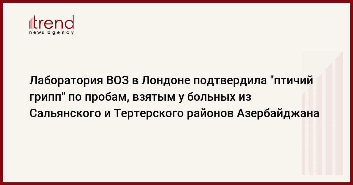 Проведенные исследования в лаборатории Всемирной Организации Здравоохранения (ВОЗ) в Лондоне подтвердили наличие вируса "птичьего гриппа" H5N1 по пробам, взятым у жителей сел Дайыкенд и Сарван Сальянского района, а также села Бейим-Саров Тертерского района. Об этом, как передает Trend , говорится в распространенном 22 марта пресс-релизе Министерства здравоохранения Азербайджана.
