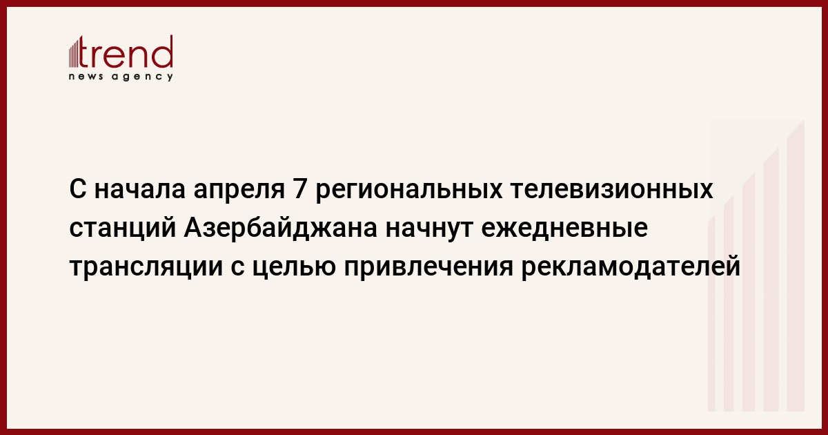 С начала апреля семь региональных телевизионных станций Азербайджана начнут ежедневные трехчасовые трансляции художественно-развлекательных программ. Как сообщили Trend в бакинском представительстве американской неправительственной организации IREX, технические характеристики станций позволяют вести трансляцию, учитывая тот факт, что все 7 станций оснащены 1-киловаттными передатчиками, привезенными в республику в июне-июле прошлого года.