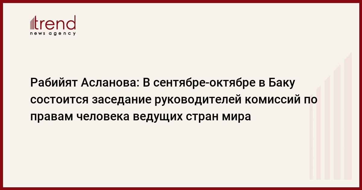 В сентябре-октябре в Азербайджан прибудут руководители комиссий по правам человека ведущих стран мира с целью ознакомления с ситуацией по защите прав человека в стране. Об этом Trend сообщила председатель постоянной комиссии Милли меджлиса по вопросам прав человека Рабийят Асланова.