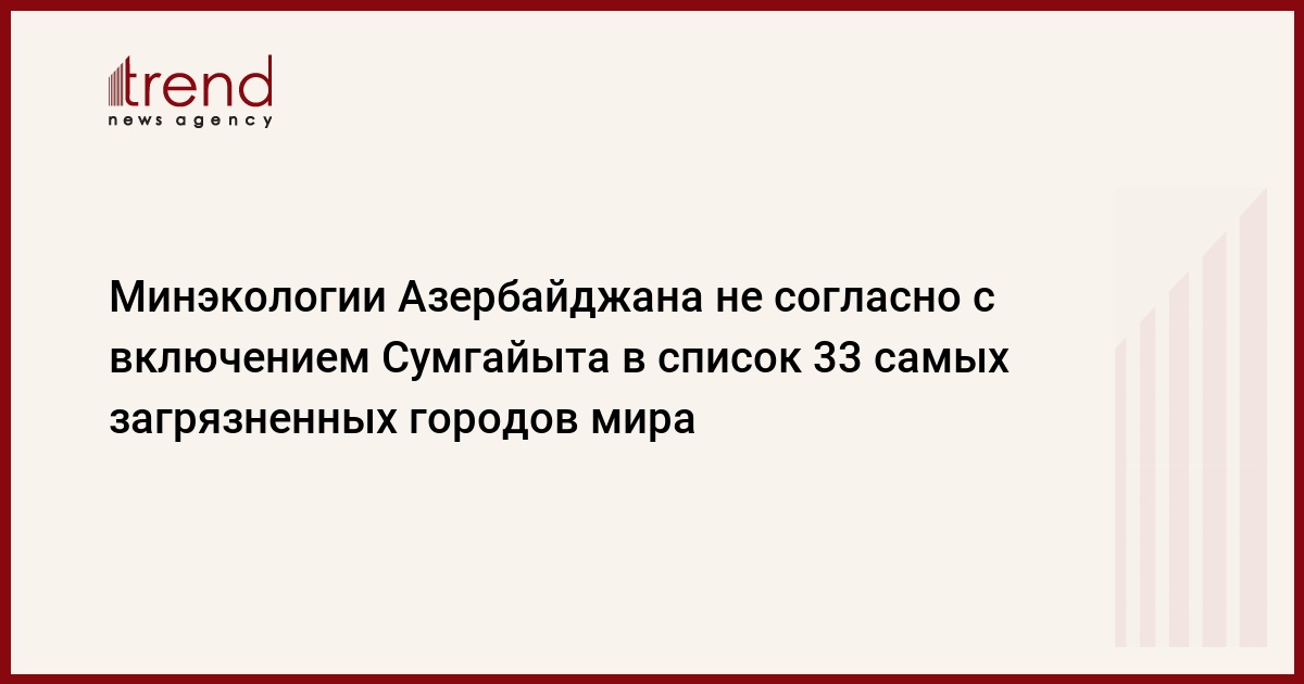 Министерство экологии и природных ресурсов Азербайджана выразило несогласие с включением азербайджанского города Сумгайыт в список 33 самых загрязненных городов мира, подготовленный Блэксмитским институтом со штаб- квартирой в Hью-Йорке, передает Trend .