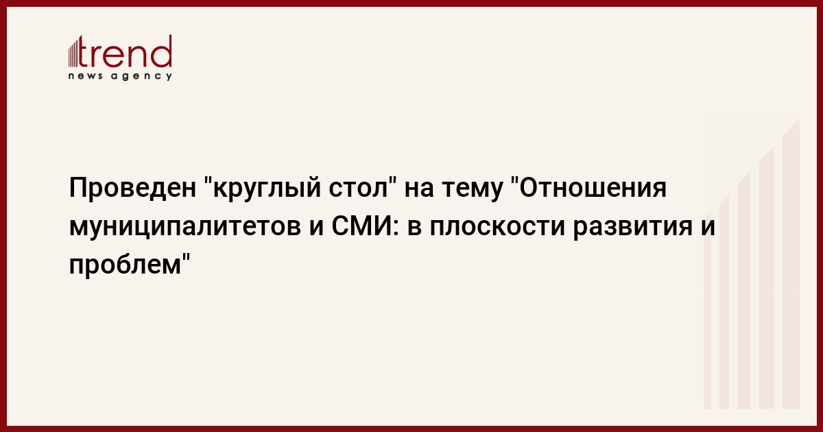 9 ноября в Международном пресс-центре по инициативе Ассоциации помощи развитию гражданского общества в Азербайджане прошел "круглый стол" на тему "Отношения муниципалитетов и СМИ: в плоскости развития и проблем". Как передает Trend , на мероприятии с докладом о муниципалитетах и их деятельности выступил эксперт ассоциации Вугар Тофигли.