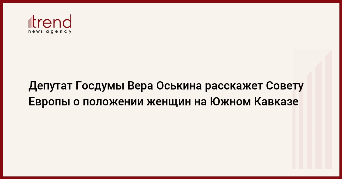 В ноябре депутат Государственной Думы от Красноярского края Вера Оськина представит доклад "Положение женщин в странах Южного Кавказа" на Парламентской ассамблее Совета Европы на Комиссии по равным возможностям в принятии решений мужчин и женщин, сообщает Trend .